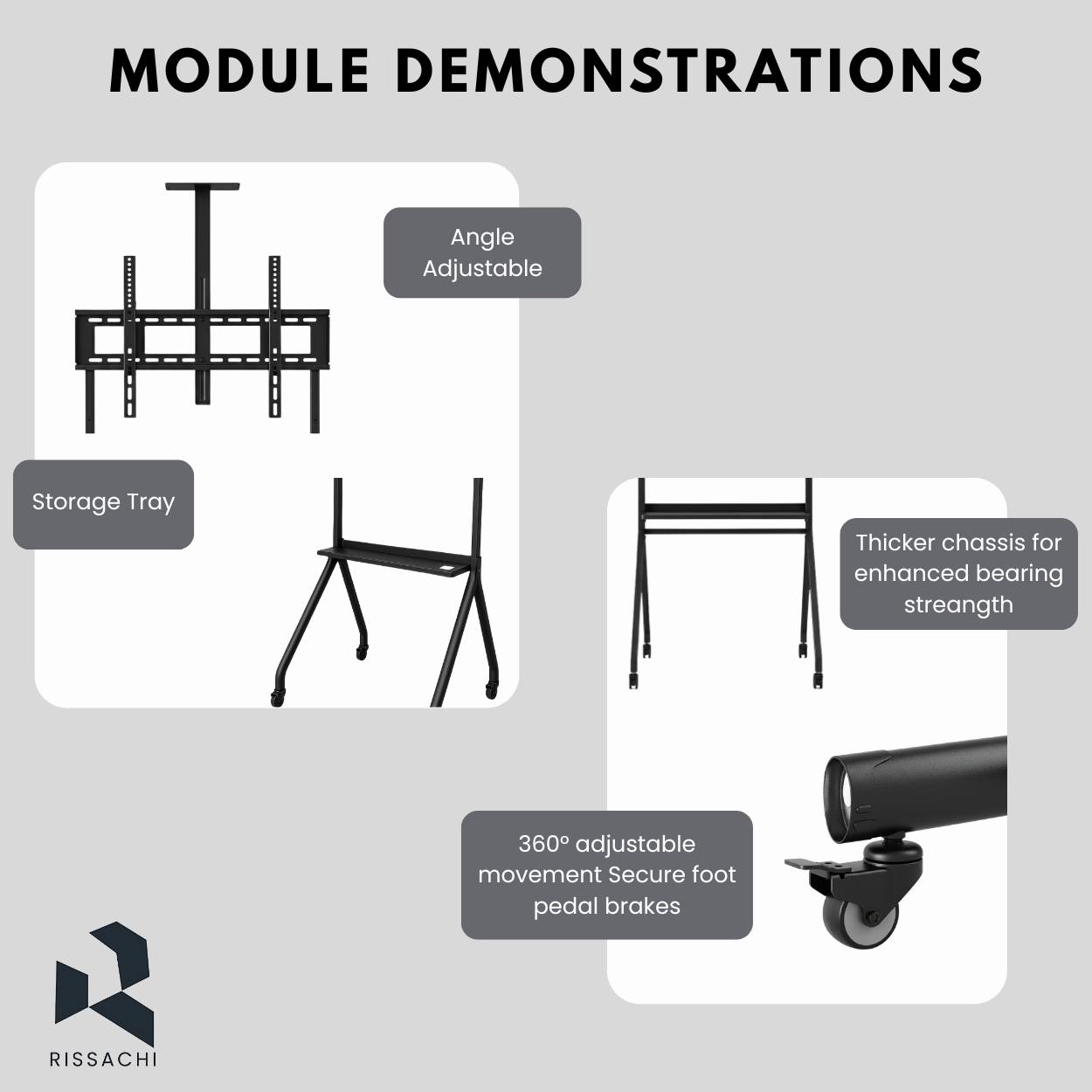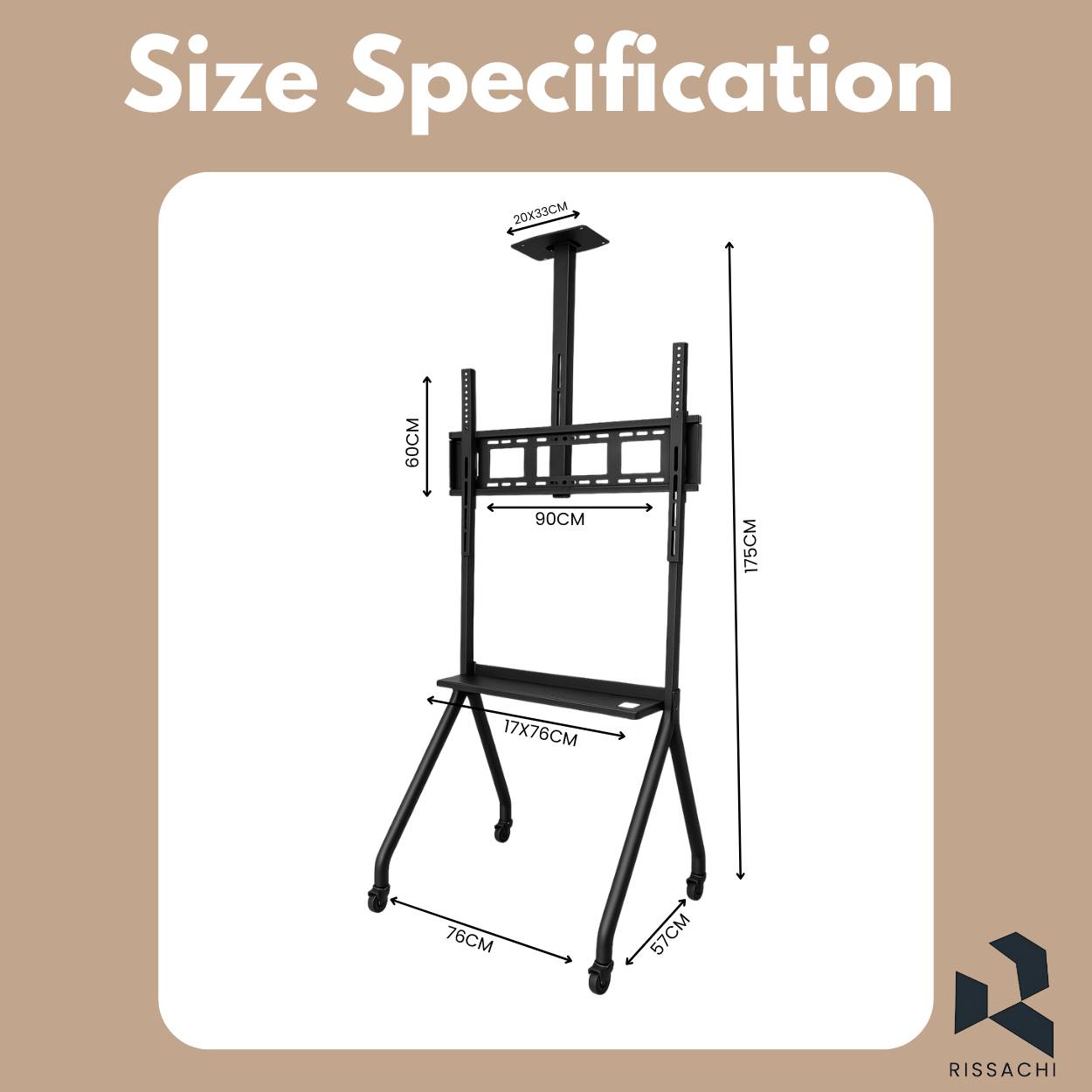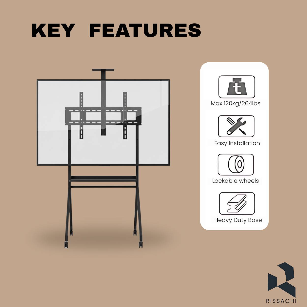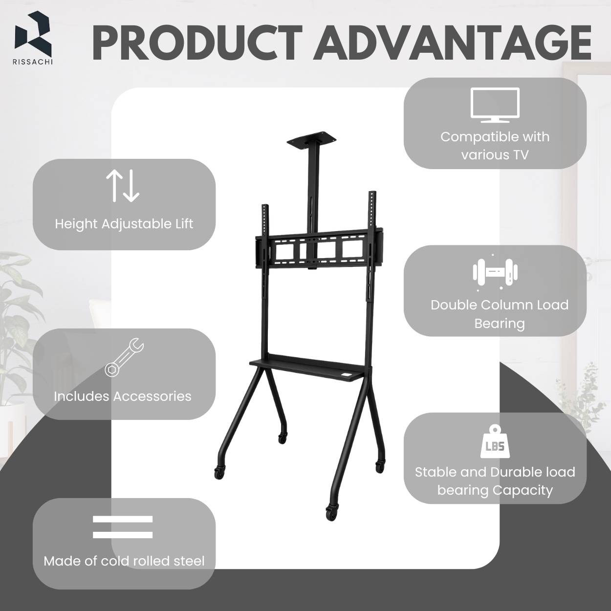 RISSACHI TV Stand Movable is a strong, practical, and flexible solution for modern homes, offices, classrooms, and showrooms. Designed as a premium TV stand movable floor trolley, it allows you to easily move your television from one room to another without wall drilling or permanent installation. The smooth-rolling wheels confirm effortless mobility, while the locking mechanism keeps the stand stable when placed. This TV stand movable features an adjustable height design, helping you achieve the perfect viewing angle whether you are sitting, standing, or presenting. The universal mounting system supports 55–100 inch LED, LCD, and Smart TVs, making it suitable for most popular TV brands. Its heavy-duty iron frame offers excellent strength and durability, with a self-hold capacity of up to 100kg, confirming your TV remains secure at all times. Best for conference rooms, exhibitions, hospitals, classrooms, and home entertainment setups, this TV stand movable floor trolley helps save space while improving viewing flexibility. The open design allows easy cable management, keeping wires organized and reducing clutter. Assembly is simple with clearly marked parts and included hardware, so you can set it up quickly without professional help.