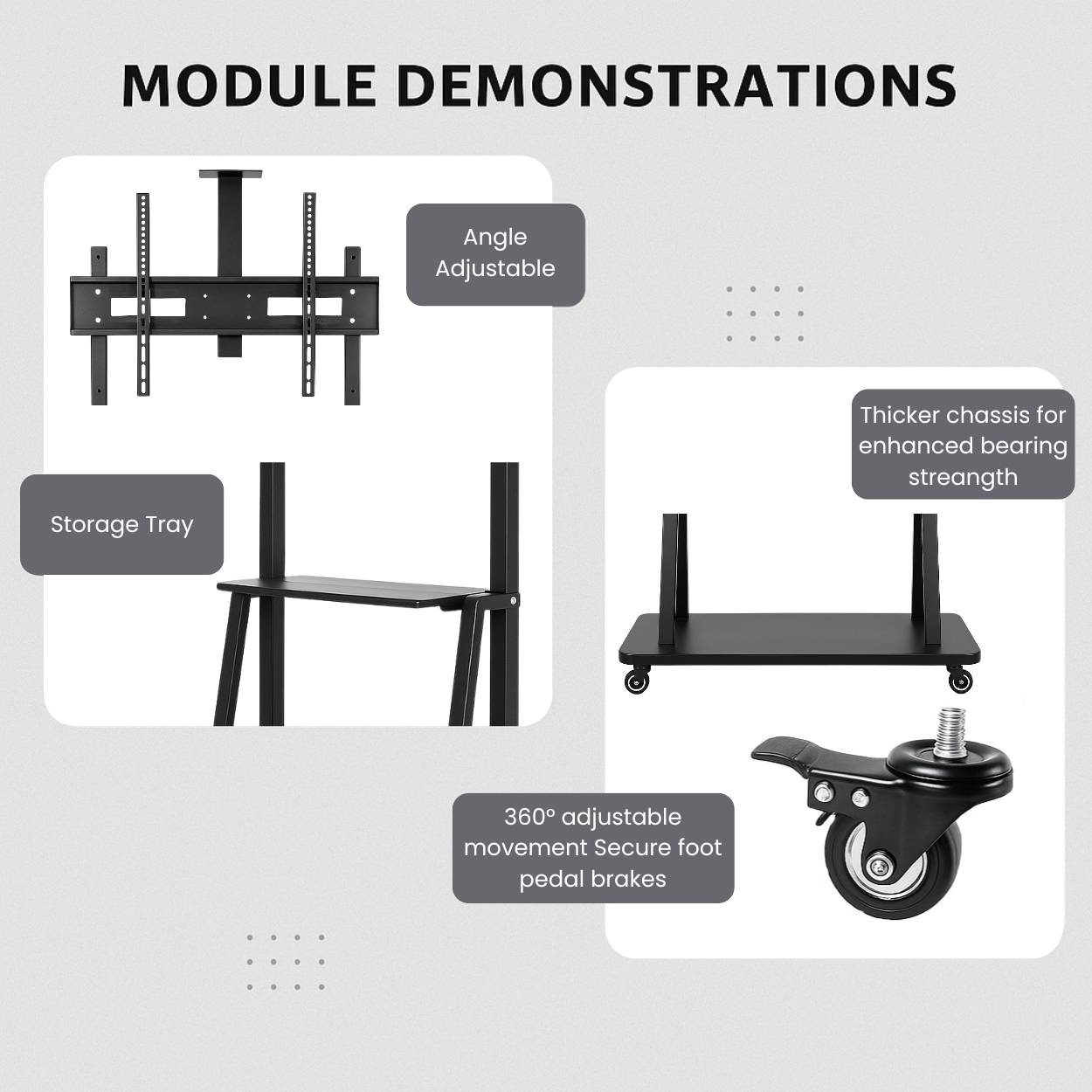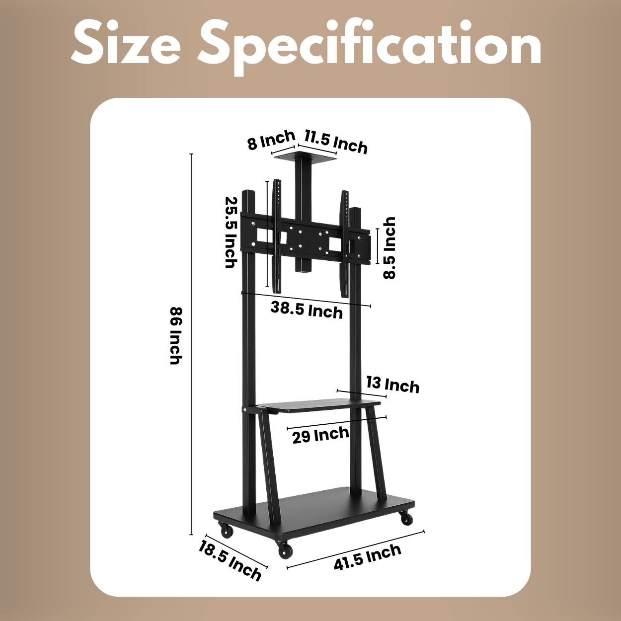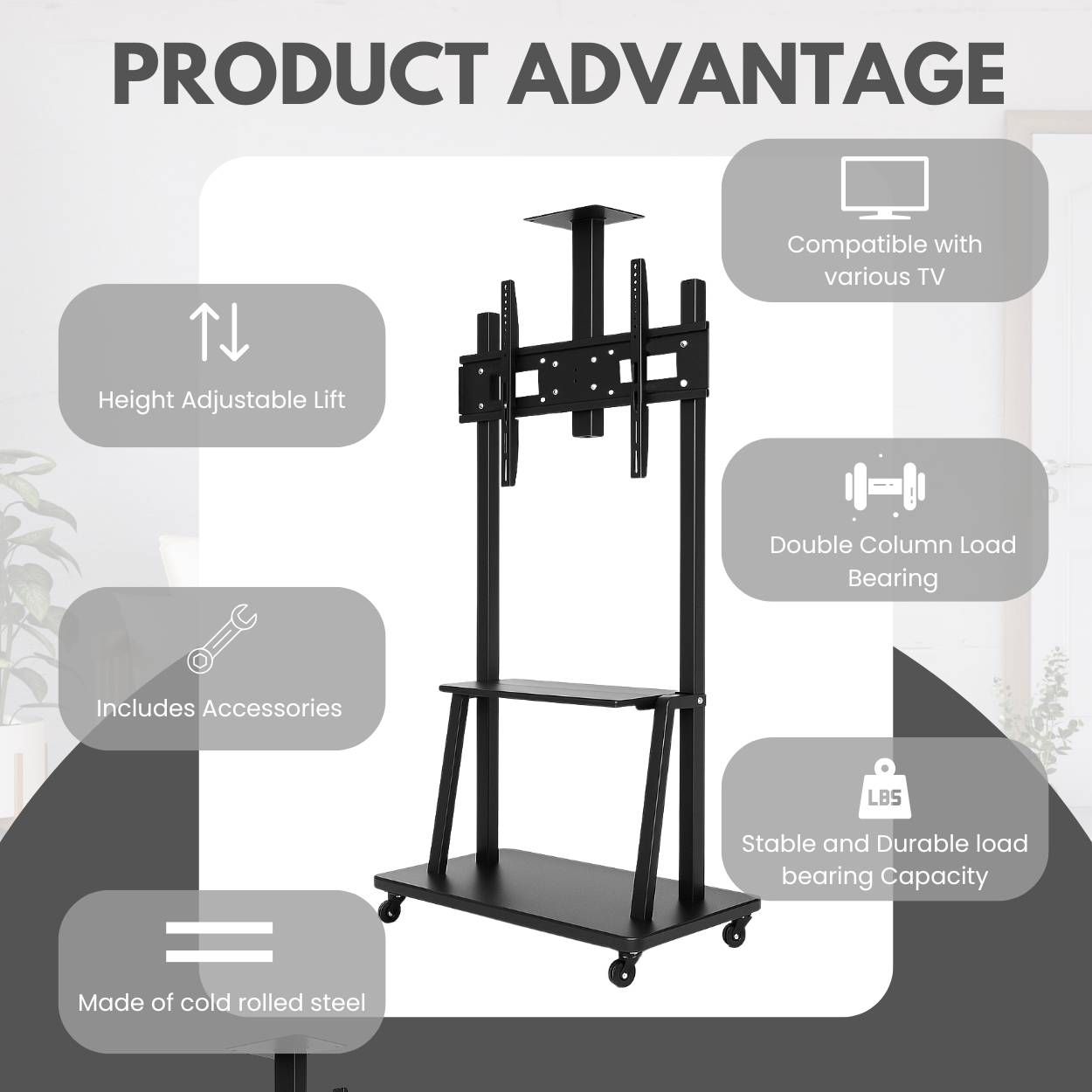 The RISSACHI tv stand table is designed to provide flexibility and convenience for modern TV setups. Built as a tv stand movable, it features a floor trolley design with smooth wheels, allowing easy movement across rooms and spaces. It works efficiently as a portable tv stand or tv trolley with wheels, making it suitable for both home and office environments. This stand supports a wide range of screen sizes from 55 to 100 inches, making it ideal for use as a 55 inch tv stand, 65 inch tv stand, or even a 75 inch tv stand. The universal mount design ensures compatibility with most LED and LCD TVs, allowing easy installation and setup. With its adjustable height feature, the tv stand table helps you set your screen at a comfortable viewing level. Whether used as a tv stand for 55 inches tv or for larger displays, it adapts to different seating arrangements and viewing preferences. The structure supports up to 50kg, providing stable support for various screen sizes. It can also be used as a portable monitor stand or led tv stand, especially in spaces where mobility and efficient placement are important. The RISSACHI tv stand movable is a practical solution for living rooms, offices, and workspaces that require easy movement, reliable support, and space-saving design.
